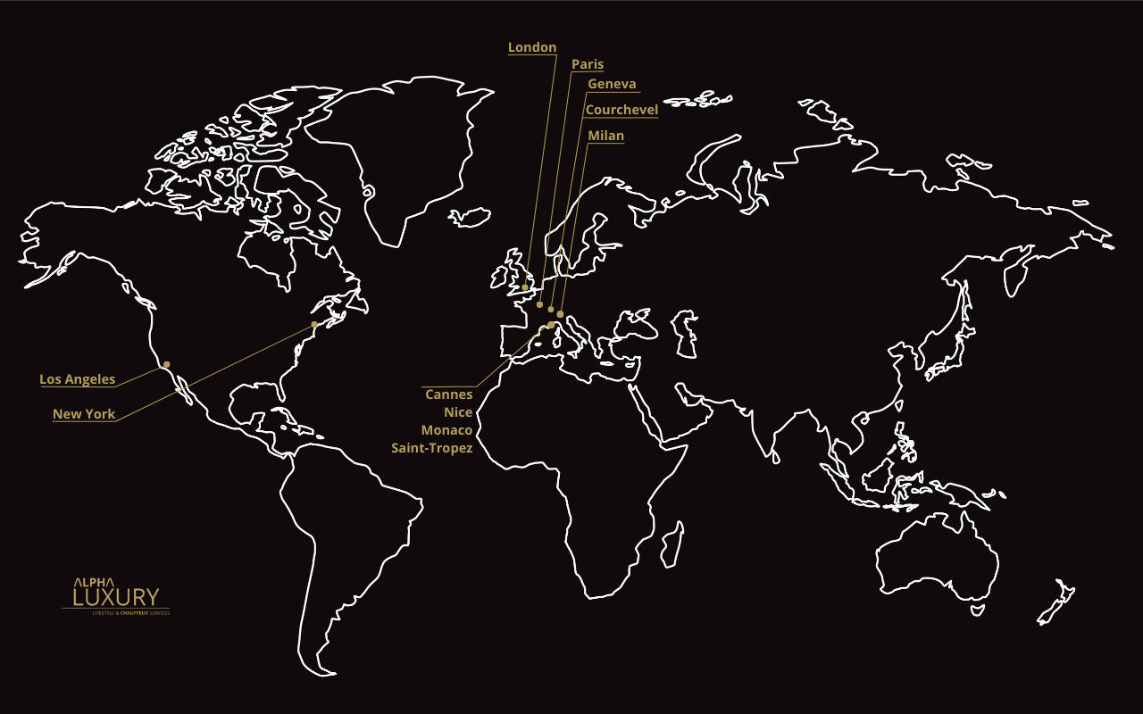 Alpha Luxury intervervient dans plusieurs pays, notamment à Paris, Londres, Cannes, Monaco et New York, et assure des transferts depuis et vers les principaux aéroports et établissements de prestige.